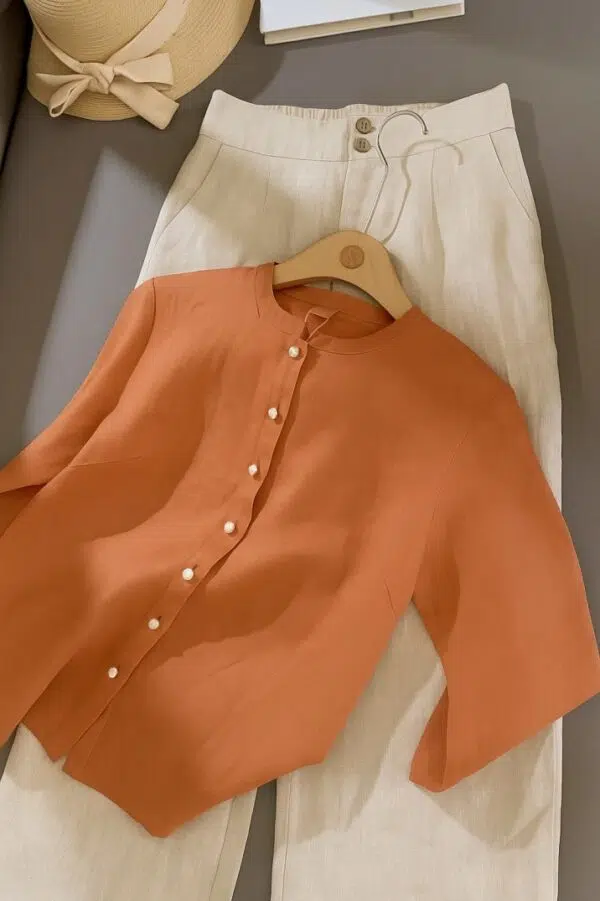 উষ্ণ টেরাকোটা / পোড়া কমলা রঙের এই টপটি তৈরি করা হয়েছে প্রাকৃতিক Remi Cotton দিয়ে, যা হালকা, শ্বাস-প্রশ্বাসযোগ্য এবং সারাদিন পরার জন্য অত্যন্ত আরামদায়ক।